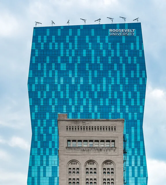 The Wabash Building is a striking glass building with rigid angles that distinguish it against the cityscape of Chicago. Participants of the Chicago Saxophone Institute have the option to stay in the dorms located in the top half of this 32 floor building (when it is not held virtually). Because of this and the simple uniqueness of the building, it is a perfect symbol to represent the institute.